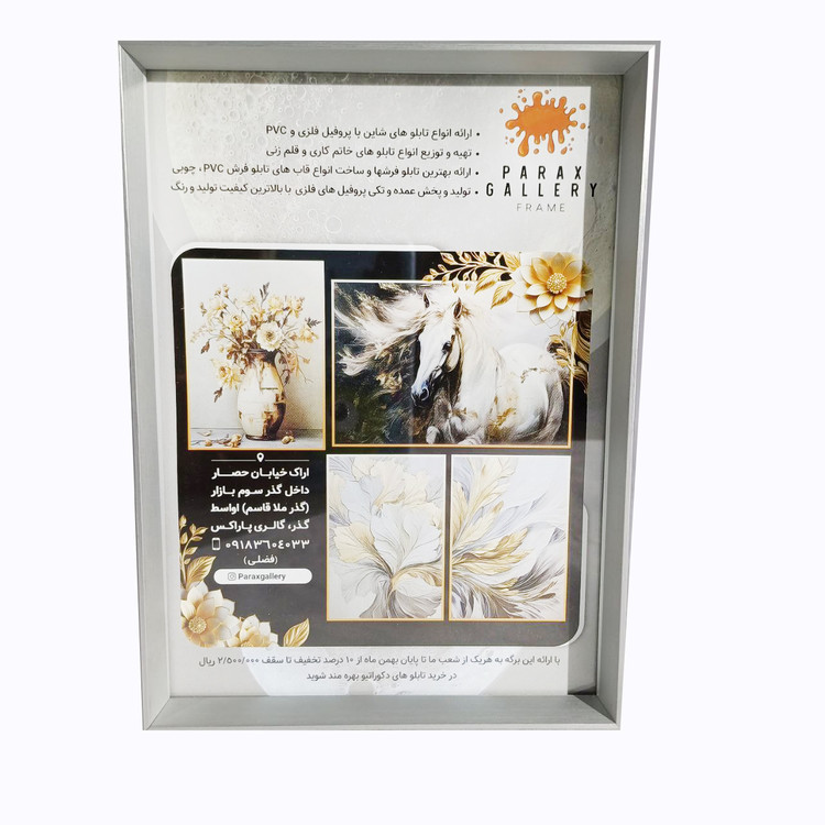رنگ نقره ای این قاب جلوه ای ظریف و در عین حال رسمی دارد و به راحتی با هر سبک فضایی هماهنگ می شود؛از دکورهای مدرن گرفته تا محیط های کاری یا هنری.